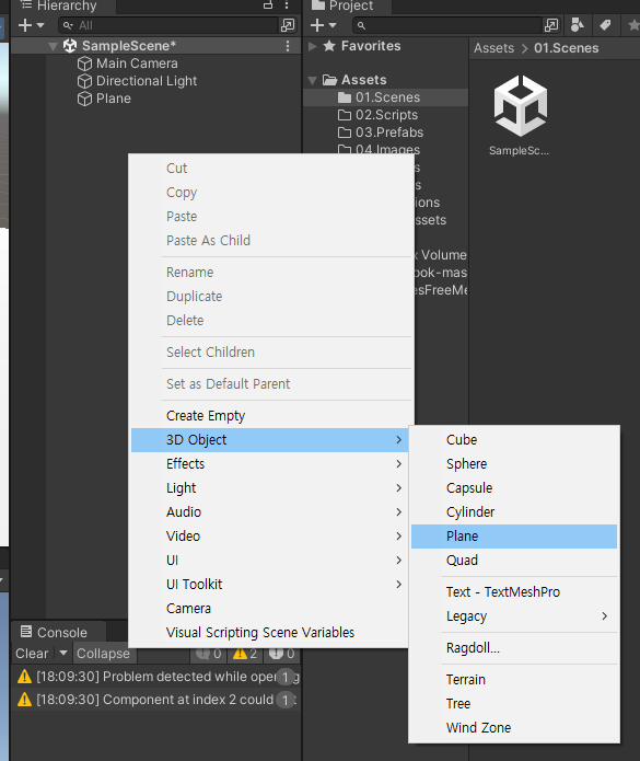 [Hierarchy] - 오른쪽 마우스클릭- [3D Object] - [Plane]