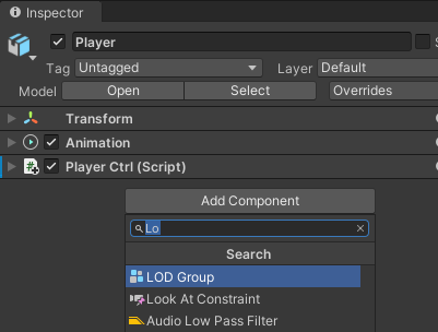 플레이어 오브젝트에 LOD Group 컴포넌트 추가