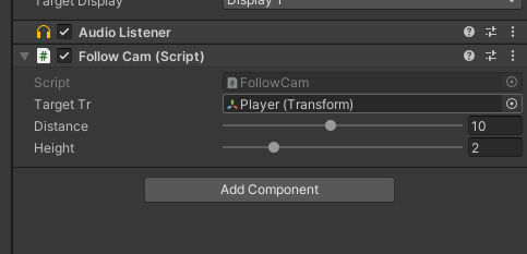 스크립트 폴더에 FollowCam 스크립트를 생성하고 Main Camera 에 추가한다.