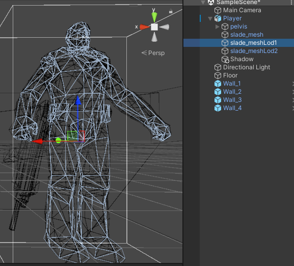 주인공의 캐릭터는 카메라와의 거리에 따라서 다른 폴리곤을 렌더링 하기 위해 3개의 모델이 합쳐진 상태이다.