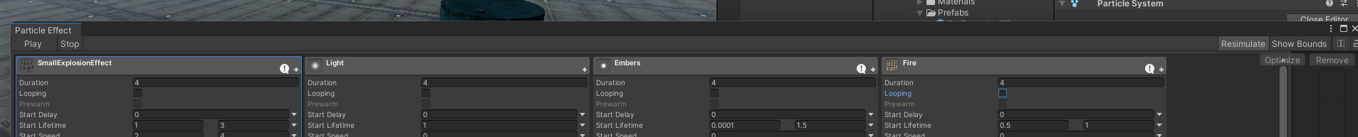 Exp Effect에는 SmallExplosionEffect 를 연결해준다. 이 이펙트도 모두 반복하기 때문에 Open Editor로 들어가서 Looping을 모두 해제해준다.