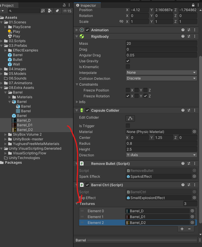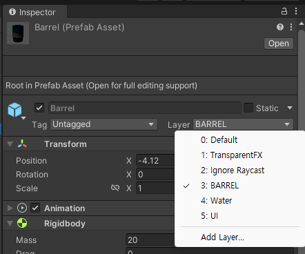BARREL 이라는 이름의 Layer를 새로 추가하고 Barrel Prefab에 레이어를 BARREL로 설정한다.