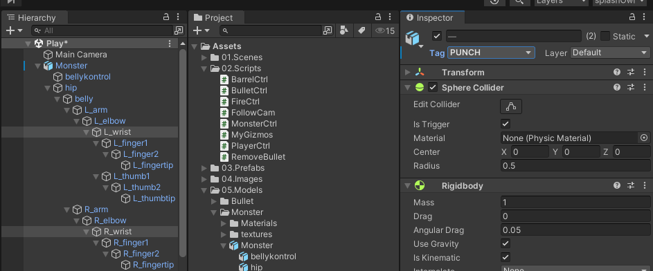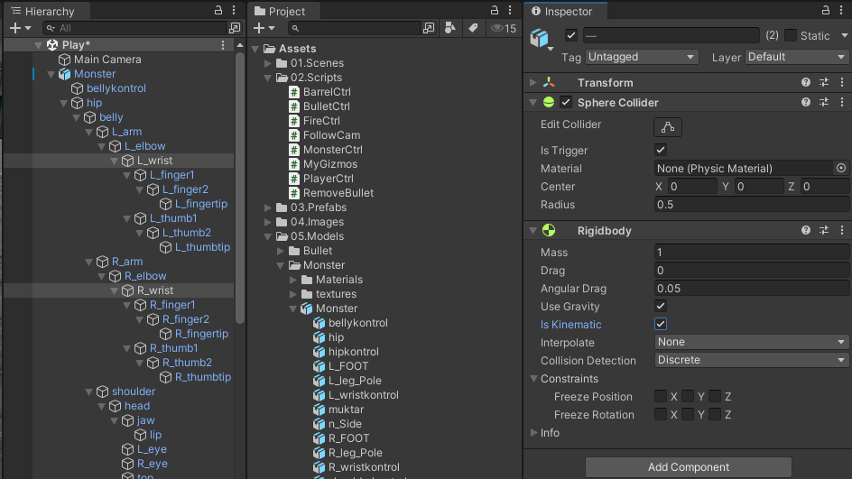 isTrigger 속성을 체크해서 몬스터 몸체에 있는 Capsule Collider 와의 물리 적인 간섭을 없앰