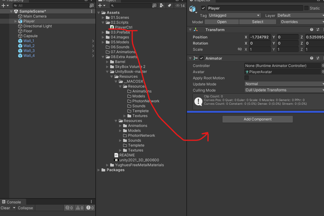 아까 만든 스크립트를 Player 오브젝트 인스펙터창 하단에 드래그 앤 드롭한다.