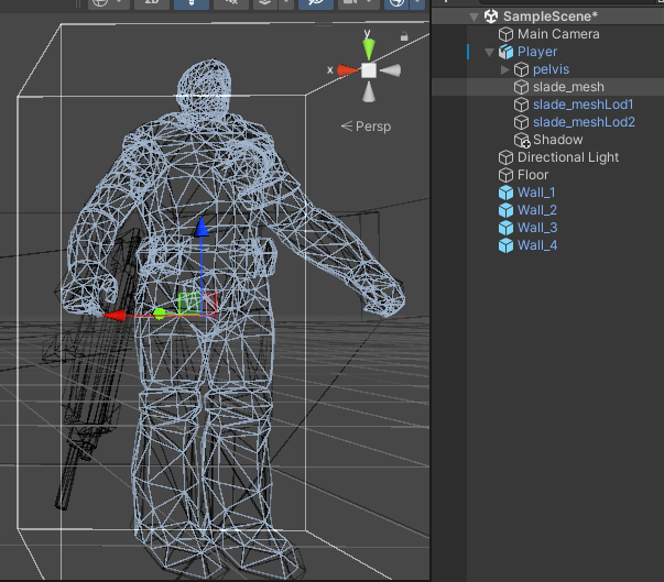 주인공의 캐릭터는 카메라와의 거리에 따라서 다른 폴리곤을 렌더링 하기 위해 3개의 모델이 합쳐진 상태이다.