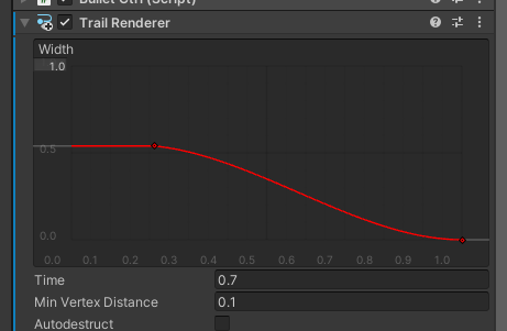방금 만든 머티리얼을 Bullet의 Trail Renderer에 연결한다.