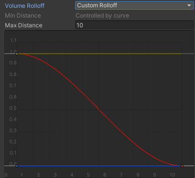 Min 과 Max 사이에 있을 때는 Volume Rolloff 옵션에 따라 볼륨이 서서히 감소한다.