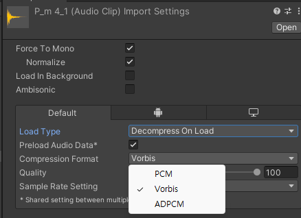 | Decompress On Load | 실행과 동시에 압축을 해제 큰 사이즈 오디오는 오버헤드 발생 작은 사이즈의 오디오에 적합 압축이 미리 해제된 상태에서 저장되기 때문 많은 메모리 사용하지만 CPU 덜소모 |