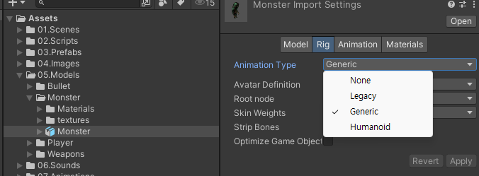 플레이어와는 다르게 몬스터는 Animator 컴포넌트가 자동으로 추가 되어있는 모습을 확인할 수 있는데 메카님이기 때문이다. 구분할 줄 알아야됨