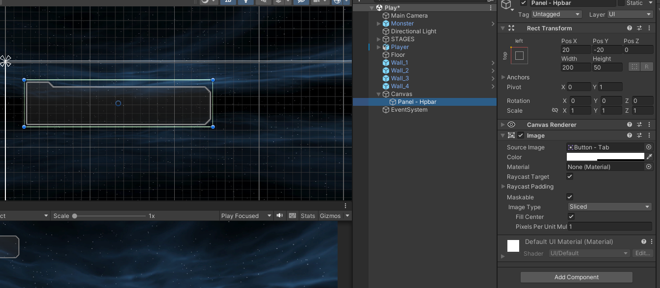 Image를 아래와 같이 생성하고 이때 hpBar는 default에서 Sprite로 변경한다.