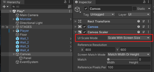 | Scale With Screen Size | 스크린 해상도에 맞게 UI를 조절, 해상도가 커지면 UI도 커짐 |