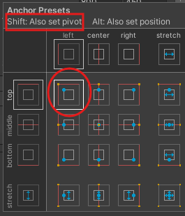 Rect Transform의 앵커는 shift를 누르고 Also set pivot으로