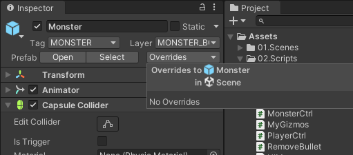 씬뷰에 있는 모든 Monster 삭제하되 먼저 Monster 가 프리팹으로 잘 들어가 있는지 확인하기