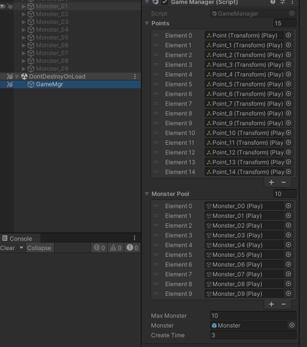DontDestoryOnLoad 씬 하위에 표시고 몬스터 10 개가 리스트에 정상적으로 들어간 것을 확인할 수 있다.