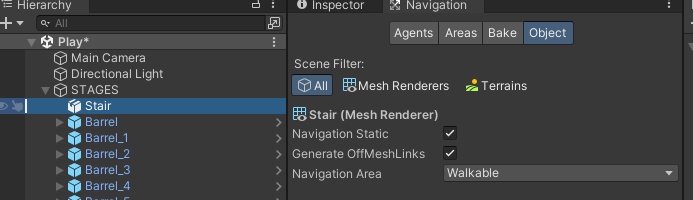 계단을 선택 후 Navigation 뷰에 Object 탭 설정이 위와 같은지 확인 꼭 두개의 속성이 체크되어 있어야함