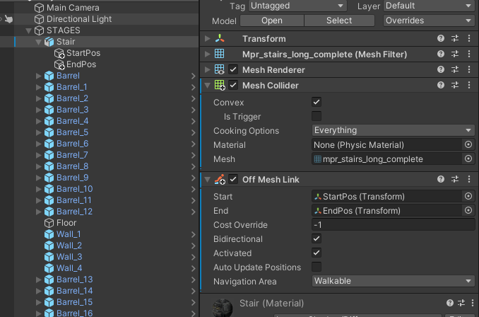 하이러키뷰의 Stair를 선택하고 Generate OffMeshLinks 속성을 언체크 하고 다시 Bake하기