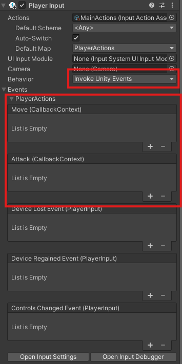 Player 의 Input 의 Behavior 속성을 Invoke Unity Events로 선택하면 정의한 두 개의 액션인 Move, Attack이 Unity Event 타입의 속성으로 표시됨