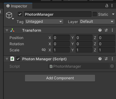새로운 빈 오브젝트를 생성하고 PhotonManager 스크립트를 연결한다
