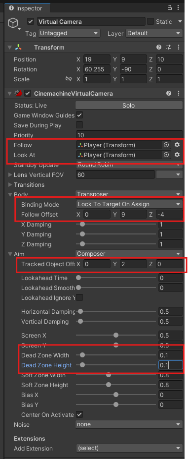 Virtual Camera 속성은 다음과 같이 설정함