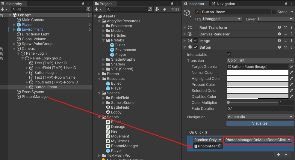 포톤 클라우드에 접속하는 과정은 Lobby씬에서 처리하기 위해 BattleField 안에 있는 PhotonManager 오브젝트는 삭제