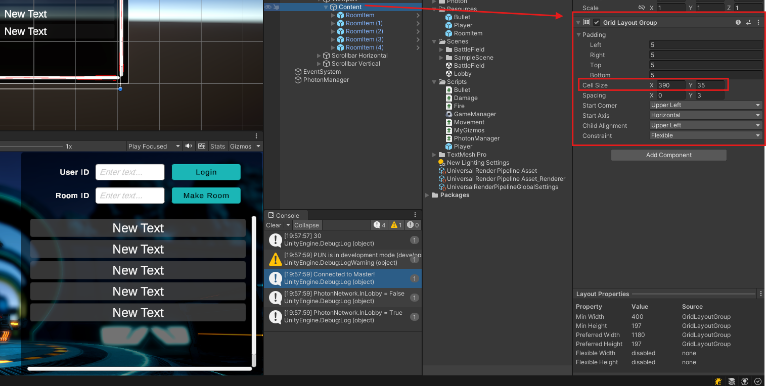 로비에 접속했을 때 포톤 클라우드 서버에서 보내주는 룸 목록을 수신받아 동적으로 구성해야하기 때문에 UI 를 디자인 하는 시점에서 생성될 룸의 개수가 몇 개인지 알 수 없으며 가변적임